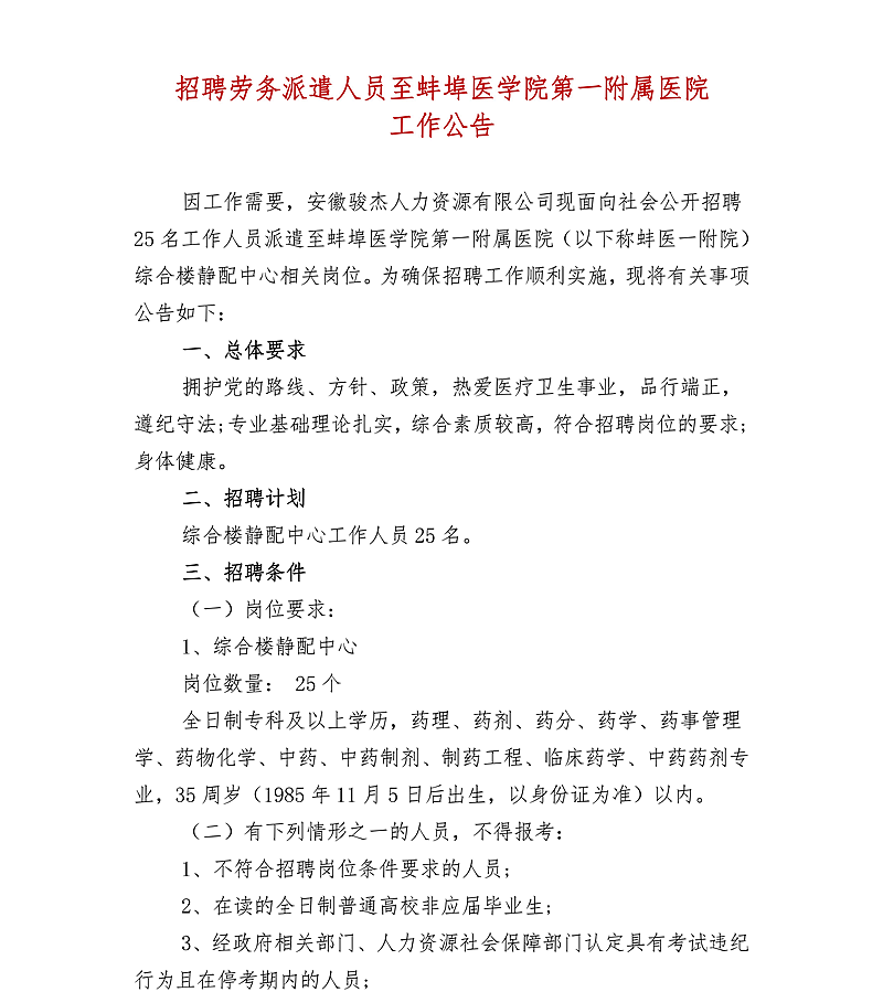 招聘勞務(wù)派遣人員至蚌埠醫(yī)學(xué)院第一附屬醫(yī)院工作公告