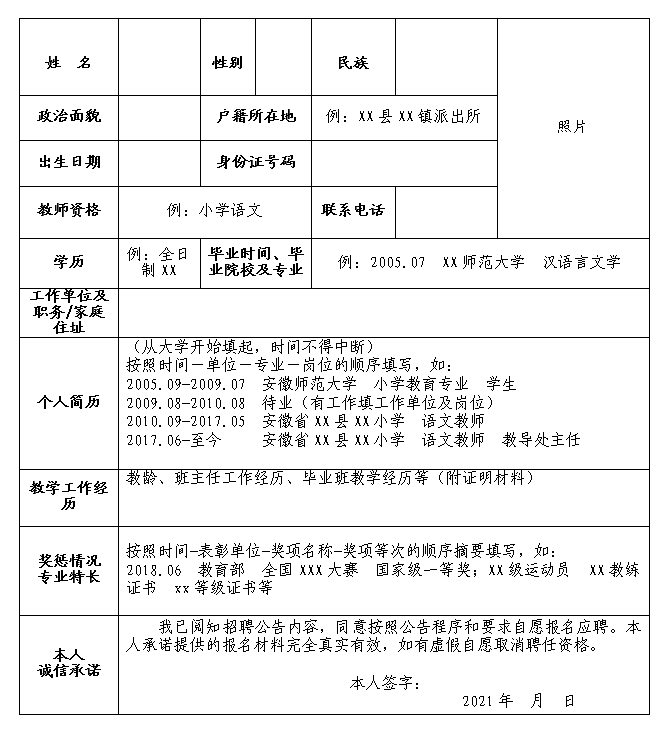 滁州市田家炳學(xué)校公開招聘編外教師報(bào)名表
